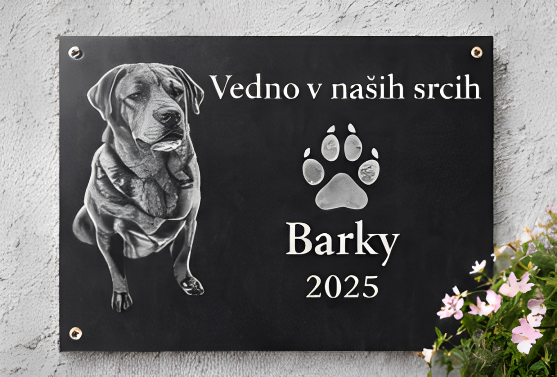 Memorial plaque made of Dibond aluminum, dimensions 20 × 15 cm. We can engrave a picture of your pet, name, date and inscription of your choice on the plaque. A lasting and beautiful memory of your loyal friend.