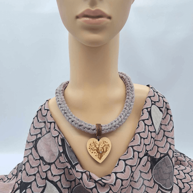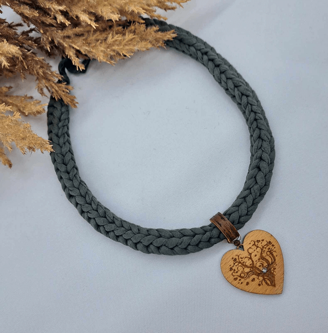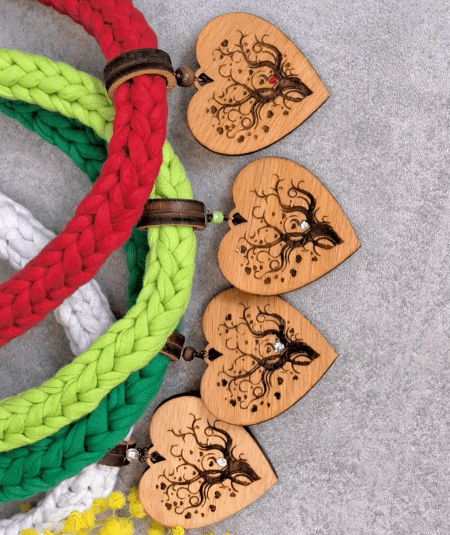 Vsaka ogrlica je dopolnjena z lesenim obeskom v obliki srčka, premazanim z mineralnim oljem, na katerem je gravirano drevo življenja – simbol moči, povezanosti in rasti.