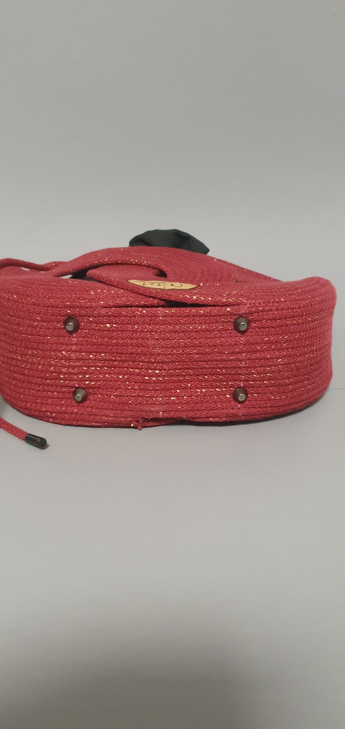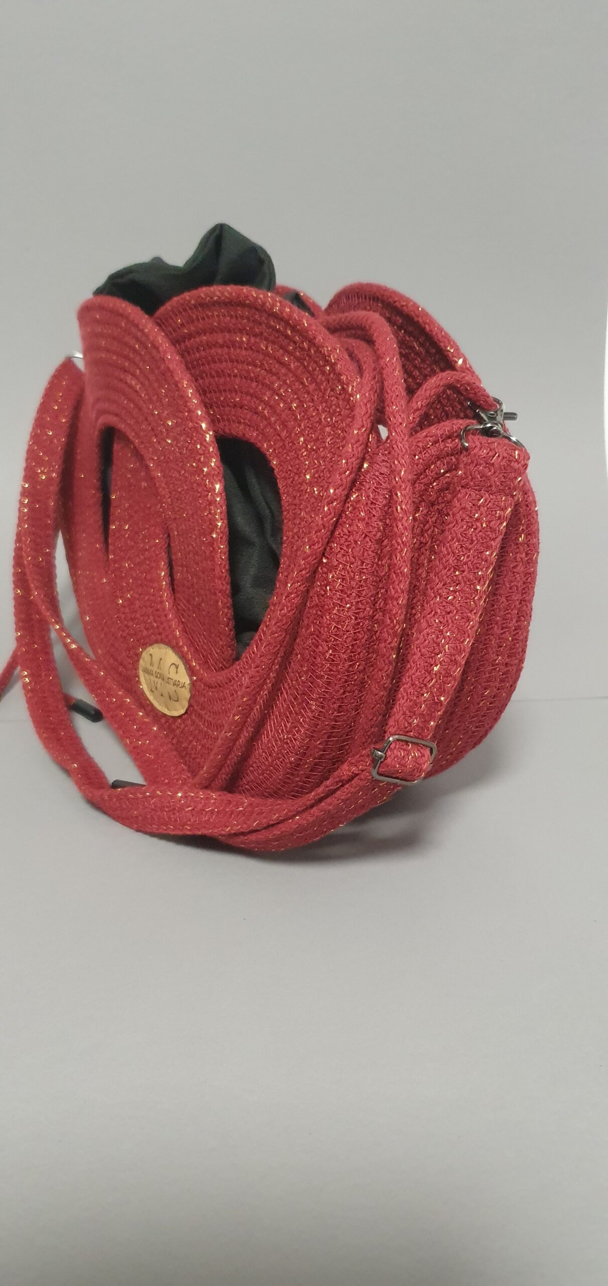 Unikatna ženska torbica, rdeča z zlatimi bleščicami.